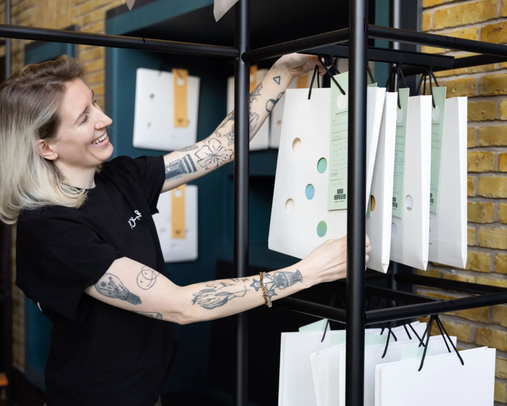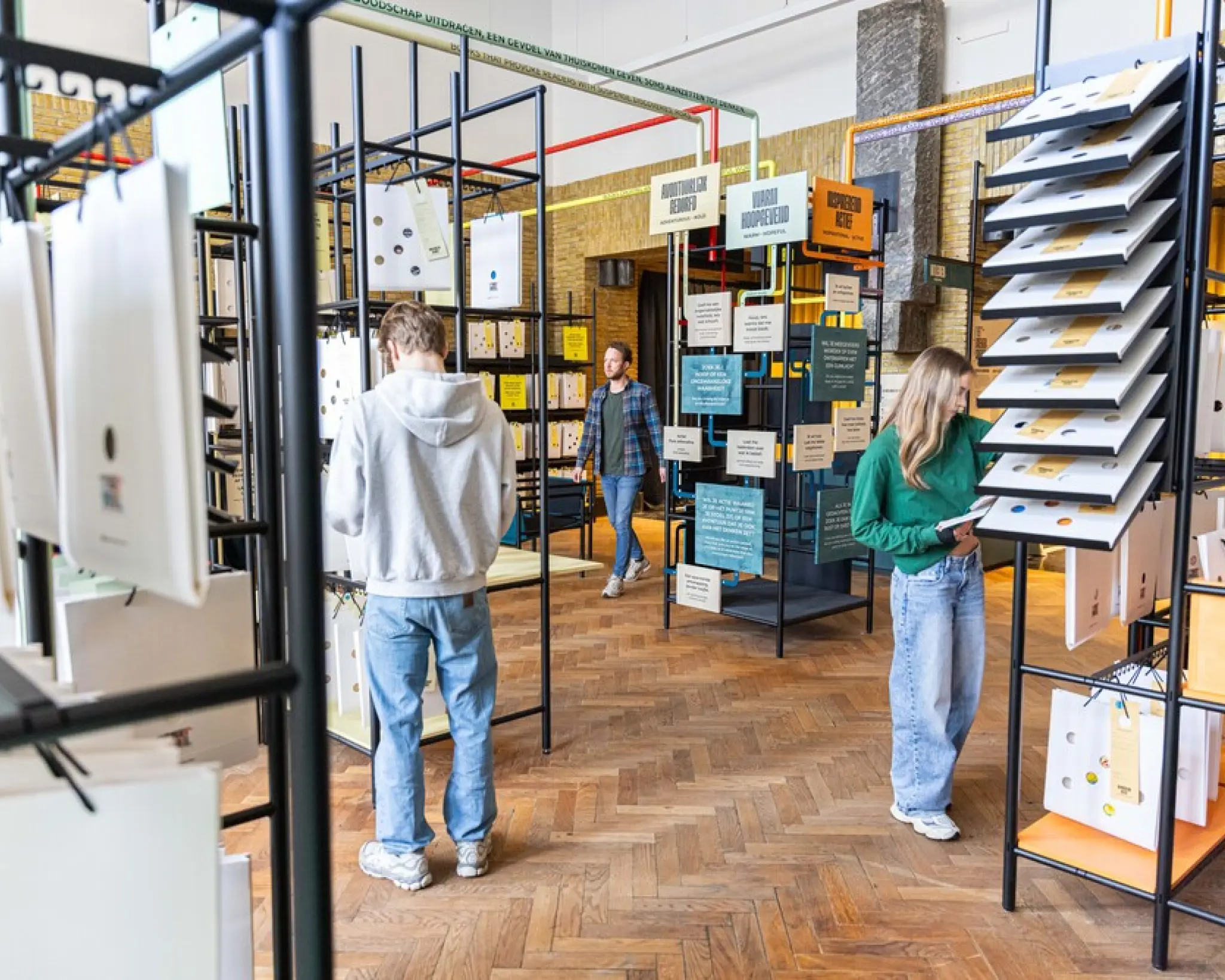 Om een verhaal te kiezen, kunnen bezoekers een route volgen met vragen die helpen hun nieuwsgierigheid te sturen. “Je kiest niet op naam of genre, maar op gevoel,” zegt Lisette. “Zo kom je in aanraking met verhalen en perspectieven die je anders misschien nooit zou ontdekken.” Die presentatie van de boeken versterkt dat principe, want elk verhaal zit in een wit tasje waarop alleen een korte typering staat. “Je gaat eigenlijk op blind date met een verhaal,” zegt Lisette. “Je wordt niet afgeleid door een mooie cover, recensies of aanbevelingen. Je kiest gewoon wat je nieuwsgierig maakt.”