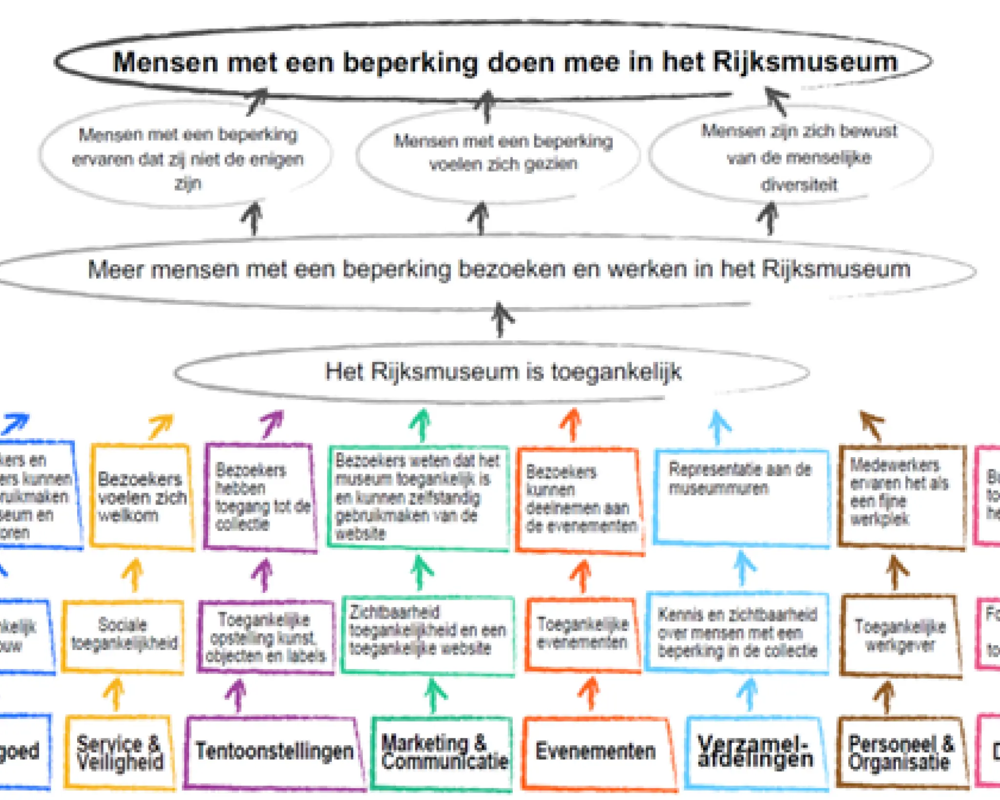 Om de samenwerking inzichtelijk te maken, werkt het Rijksmuseum met een theory of change. Dit model laat zien hoe verschillende onderdelen van de organisatie, van programmering en gebouw tot digitale toegankelijkheid en HR, samen bijdragen aan één doel: een toegankelijk Rijksmuseum voor iedereen.